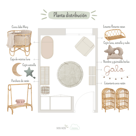 | Planta con la distribución | Moodboard o panel decorativo | Moodboard o panel decorativo |