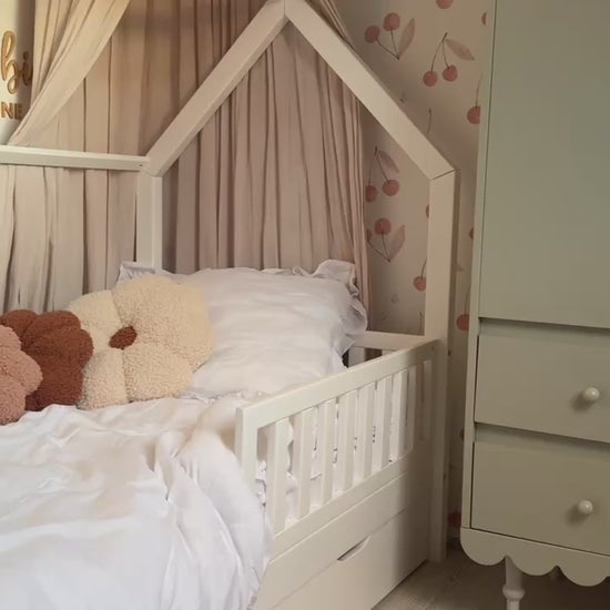 La Cama Montessori casita con cajón A CORUÑA a medida es una cama infantil de estilo escandinavo diseñada para acompañar a tu peque en su transición de la cuna a su primera cama grande. Su estructura en forma de casita, sus barandillas laterales y la opción de cajón de almacenaje o cajón con cama, la convierten en una pieza funcional, segura y mágica para su habitación.