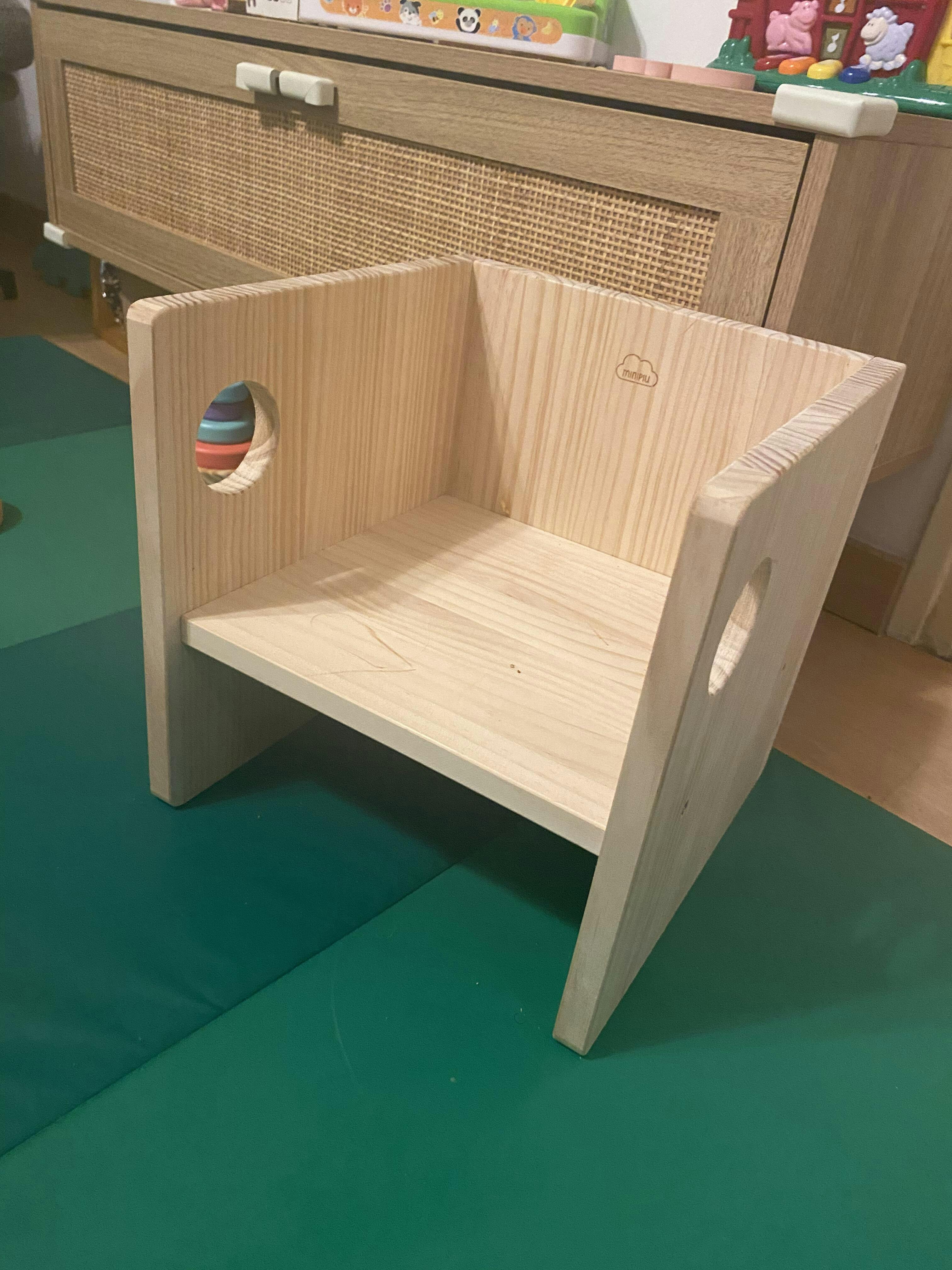 Conocimos la silla trifásica en la llar d'infants de nuestra hija y vimos que le encantaba...así que contentos que Minimpiu la fabrique y la podamos tener en casa con la madera tan 'pura'...su textura, su olor,...muy agradecidos <3
