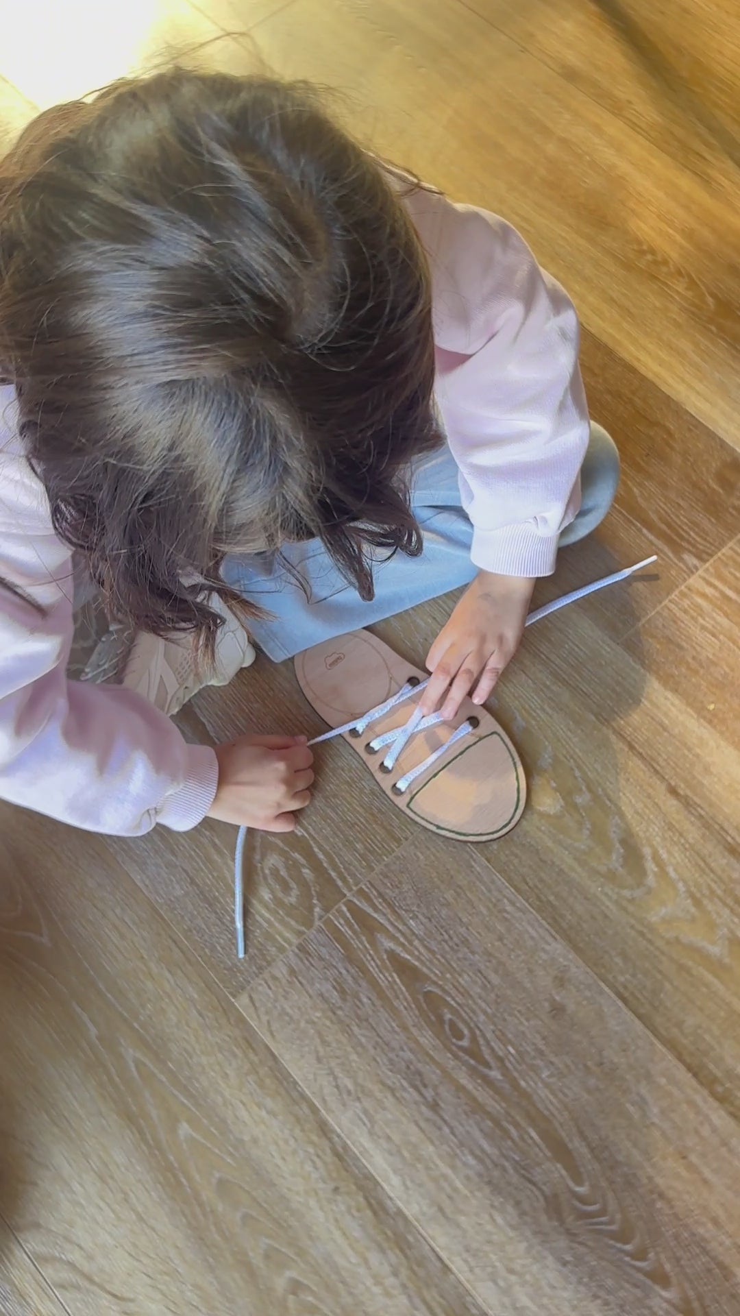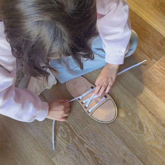 Este zapato de madera de haya es perfecto para que los peques practiquen la motricidad fina y aprendan a atarse los cordones de forma divertida y autónoma.