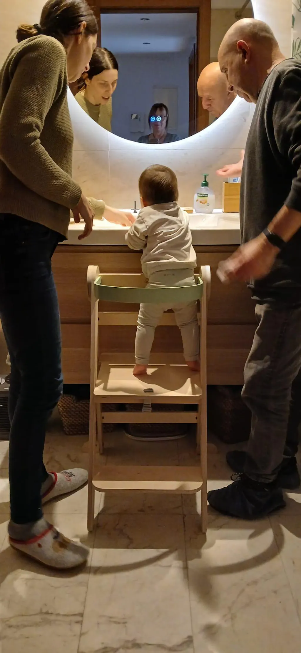 A mi hija le encanta subir y bajar de ella. Es segura, no se tambalea y es udeal para que mientras estas preparando comidas ella esta a tu lado o jugando encima de la mesa mientras esta subuds en ella